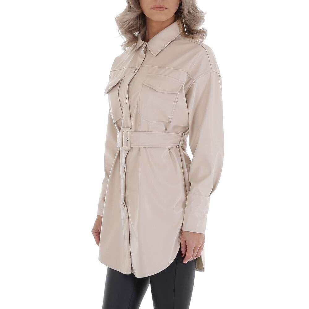 Imitatie leer, de blouse is voorzien van een borstzakje en in de taille zit een meegeleverde riem.