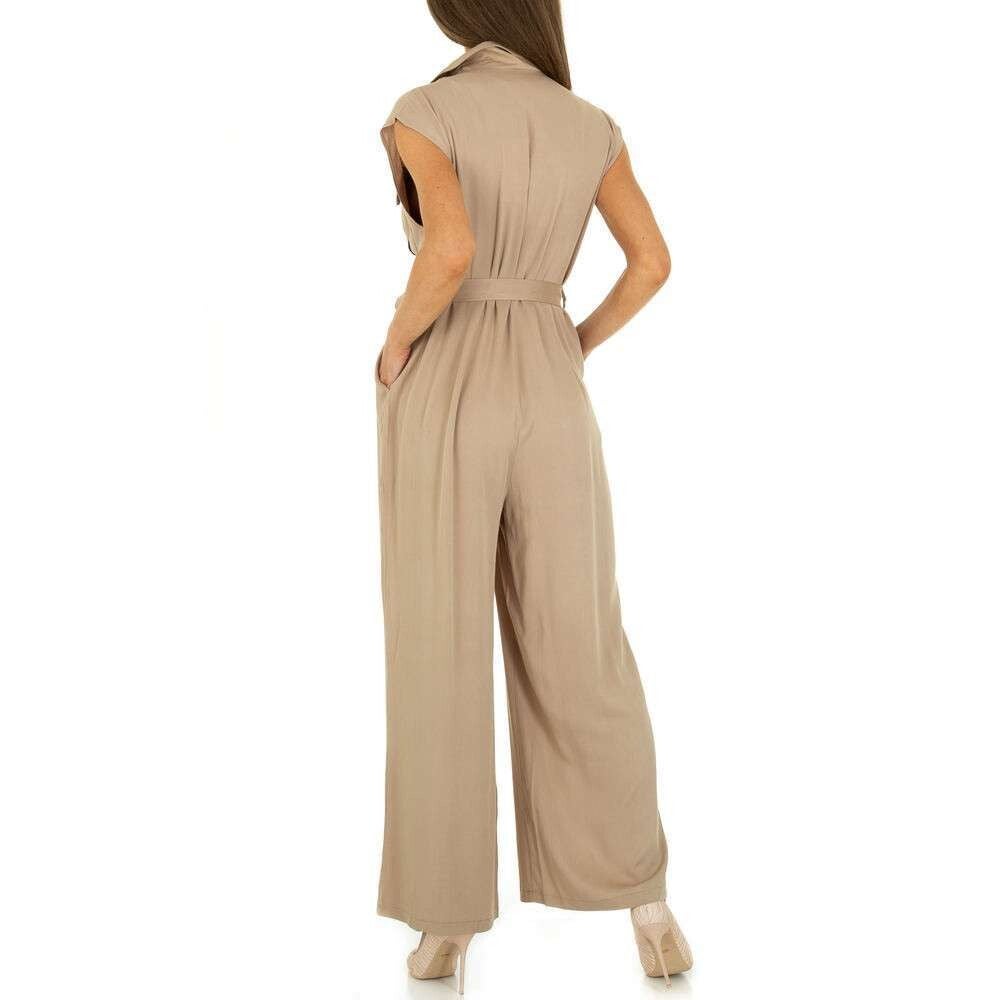 Jumpsuit met zakken en een taille band, de jumsuit heeft geen mouwen maar wel wijd uitlopende pijpen.