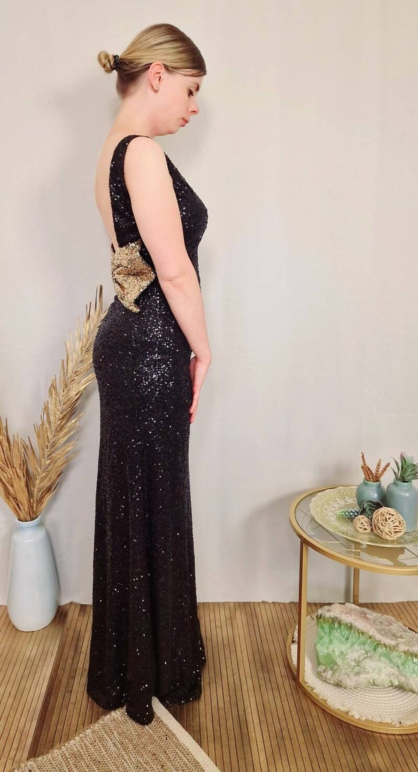 mooie aansluitende jurk, loopt wijd uit. Lage rug décolleté met een grote strik van gouden pailetten.