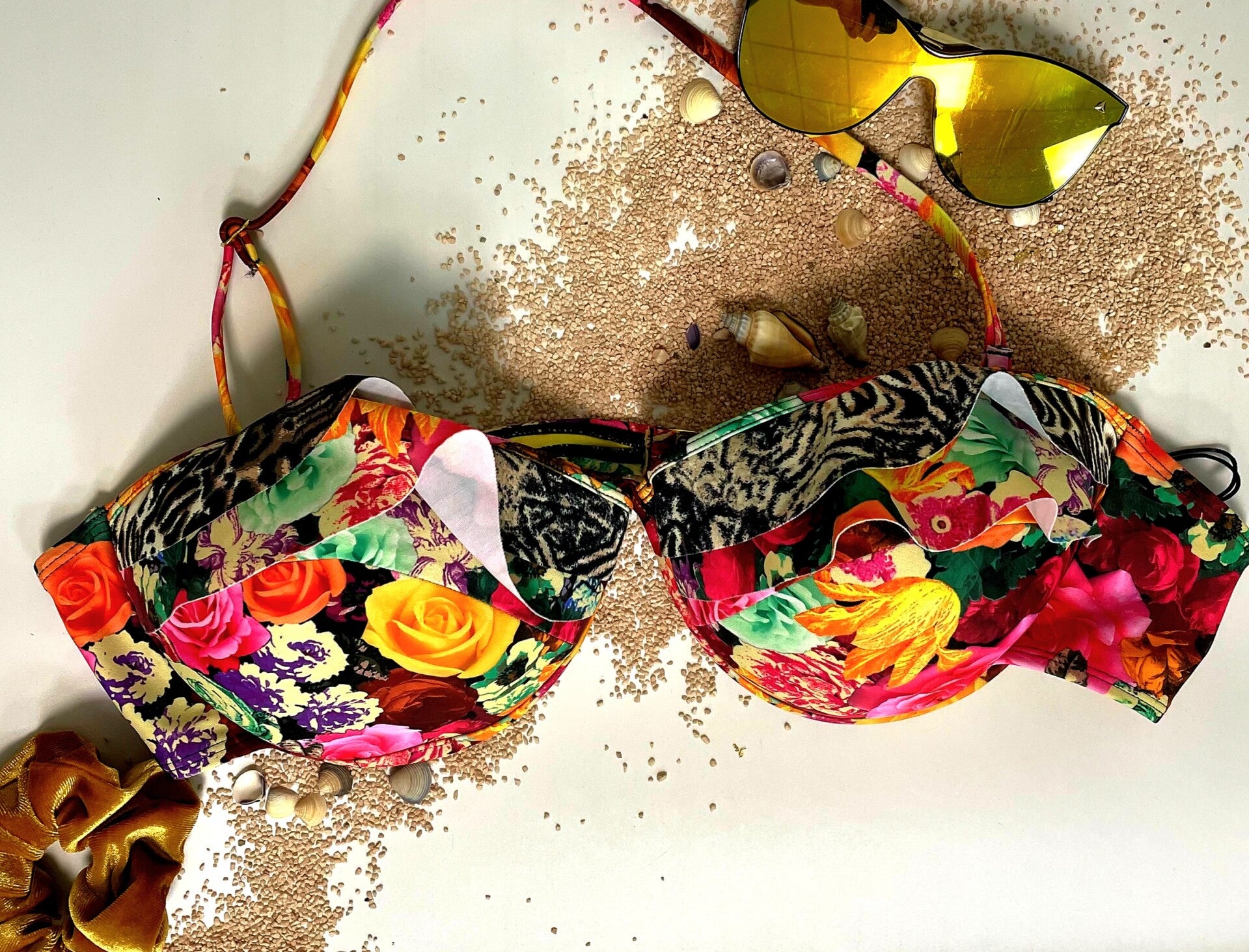 voorgevormde beugel bandeau top met bloemenprint en roesje met afneembaar bandje.