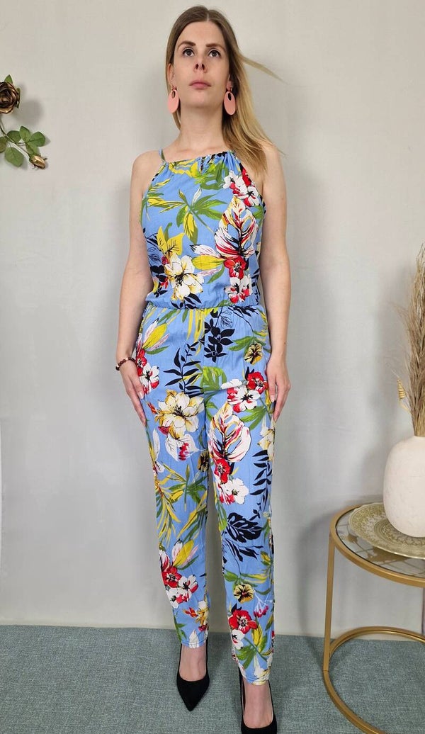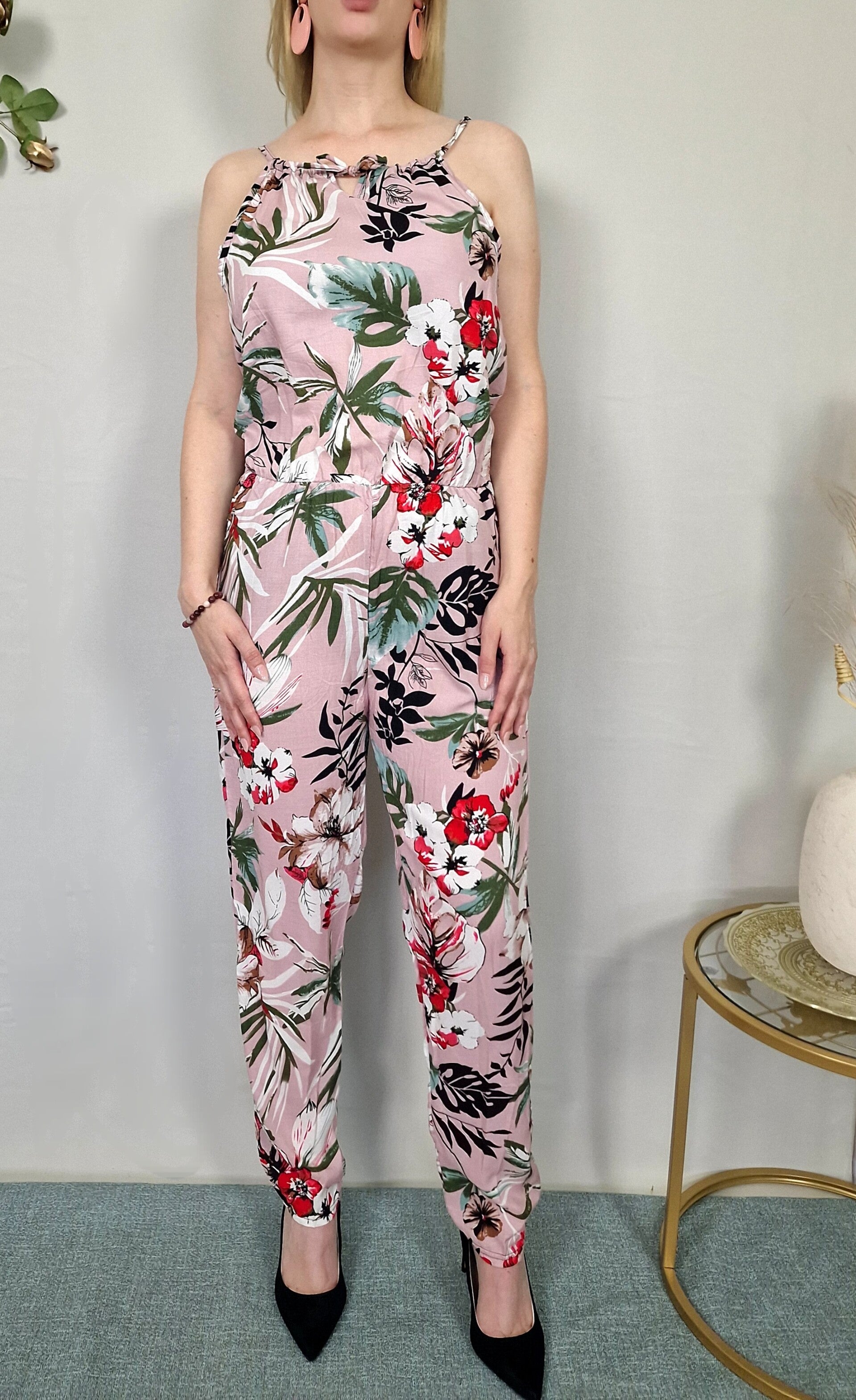 Jumpsuite met bloemetjes patroon, spagetti bandjes en getaileerd in de kleuren Oud Roze en Pastel Blauw.