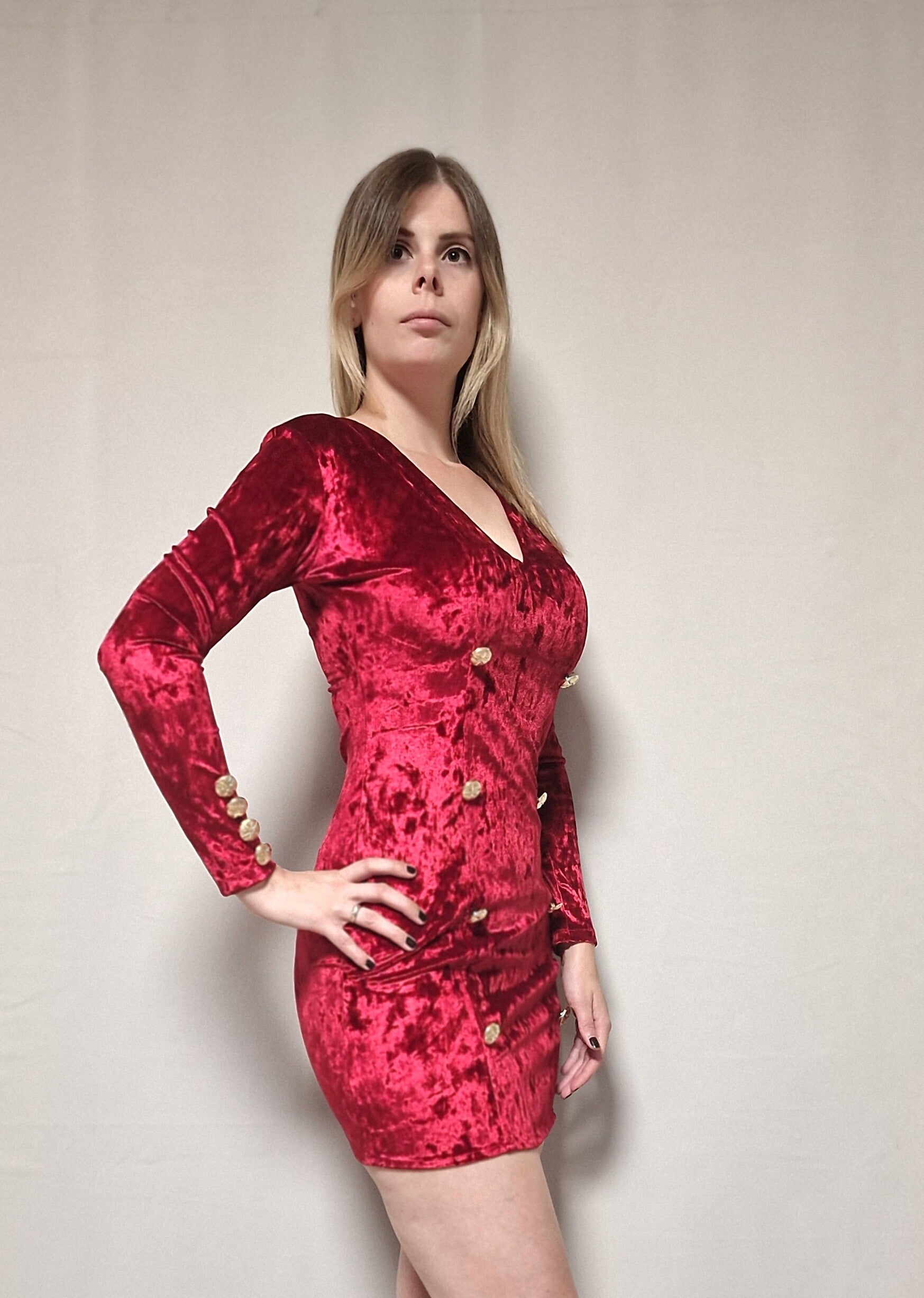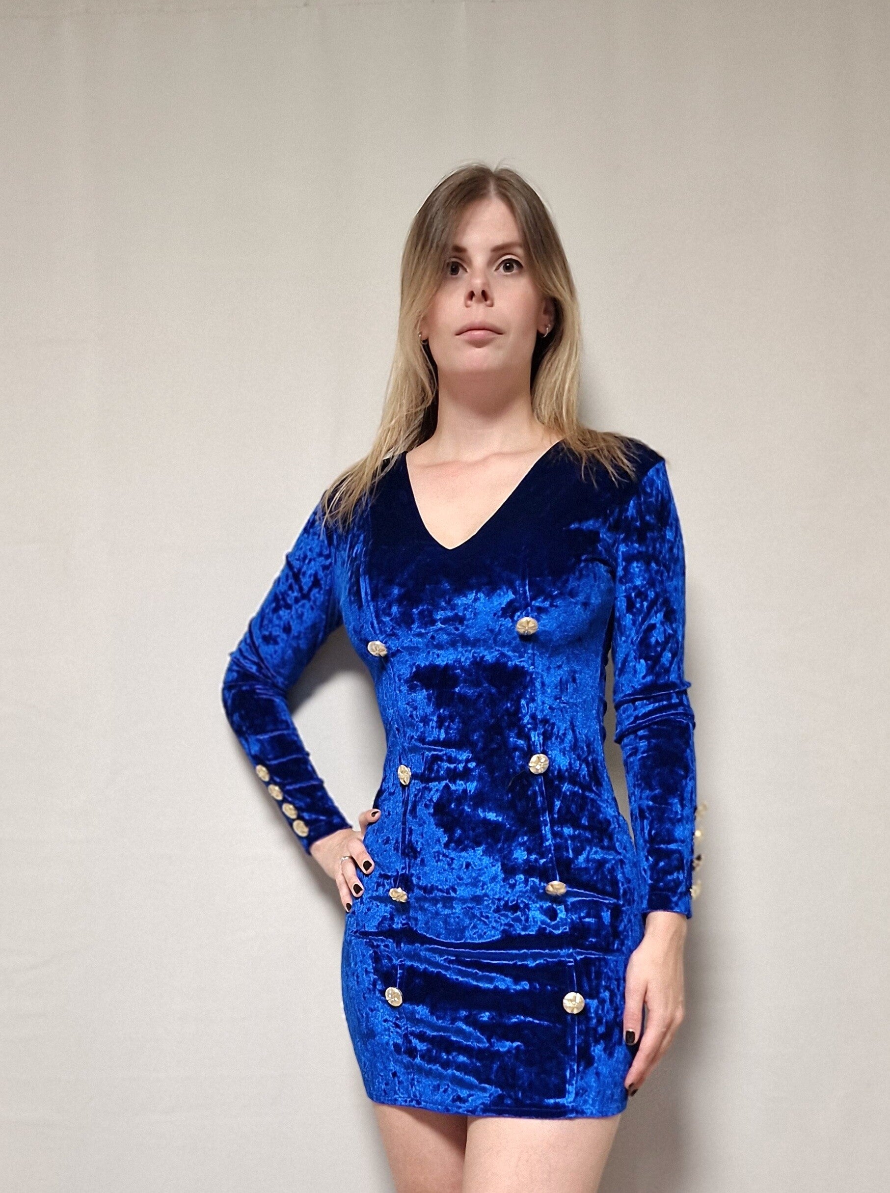 Mini dress van velvet stof, een V-hals en grote decoratieve knopen.